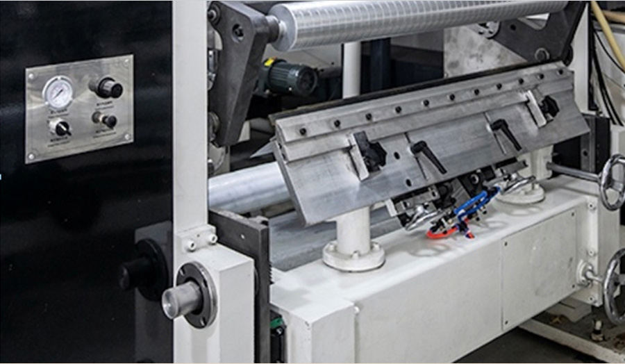 擠壓分切在國內(nèi)分切機(jī)上并不常見,它主要是由與材料速度同步并與材料有一定包角底輥和調(diào)節(jié)方便的氣動刀組成。這種分切方式既可以分切比較薄的塑料薄膜,也可以分切比較厚的紙張、無紡布等。是一種比較方便的分切方式。是分切機(jī)分切方式的一個發(fā)展方向。
